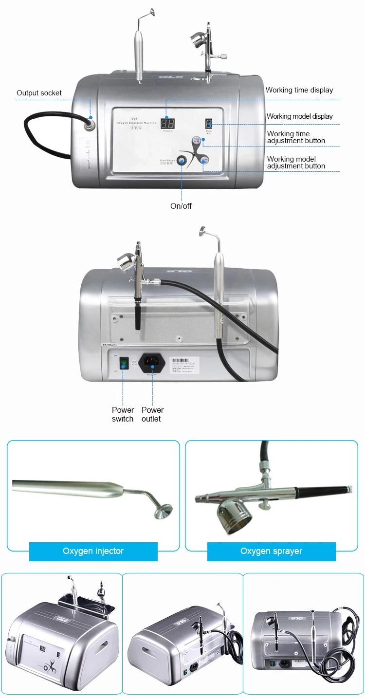 The water & oxygen jet facial machine uses oxygen under extreme pressure and water, takes tiny water drops, through spray-type to act on skin. It can penetrate nutrient components to pores and cracks of skin from the epidermis to dermis layer, then promote rebirth of cells,rapidly and directly supply rich nutrient for skin. Simultaneously, it can clear deep dirt in epidermis. Oxygen of extreme pressure and nutrient liquid can stimulate the rebirth of fiber tissue in dermis, make cells metabolism. So as to improve skin dark, yellow, chloasma, get good effect of wrinkle removal, skin rejuvenation and etc.